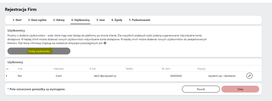 Po dodaniu i zapisaniu użytkownika / użytkowników przejdź Dalej.
