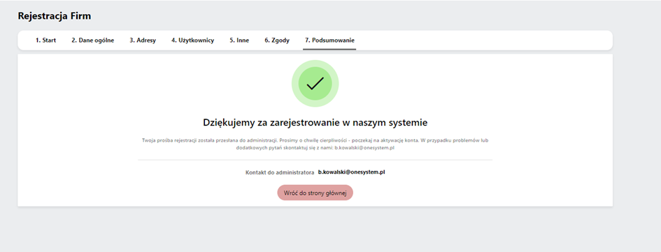 Proces rejestracji zakończony! Teraz poczekaj na zaakceptowanie konta przez Administratora systemu. Nastąpi to maksymalnie w ciągu 24 godzin roboczych od momentu wypełnienia formularza rejestracyjnego.