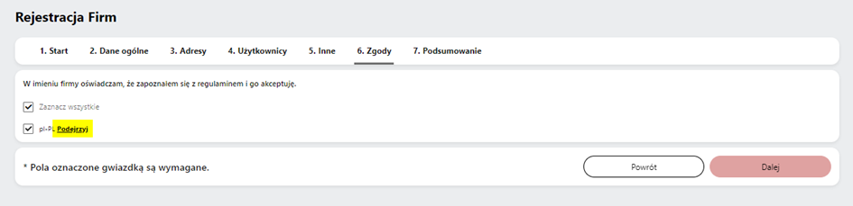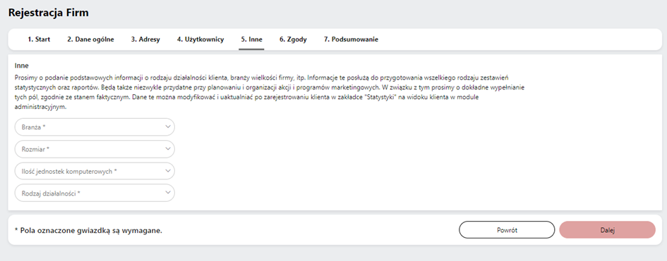 w kolejnym kroku wpisz podstawowe informacje dotyczące firmy. (Uwaga – wszystkie pola są wymagane, jednak podane informacje posłużą nam do celów statystycznych. Po uzupełnieniu informacji kliknij Dalej).