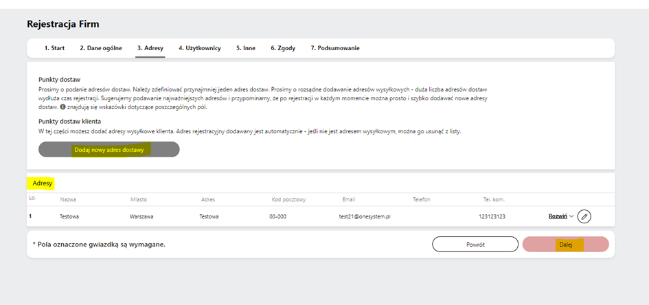 w kroku trzecim sprawdź Punkt dostawy (domyślnie wybrany zostanie adres, który został wpisany na poprzednim ekranie). Jeśli chcesz dodać nowy punkt dostawy, kliknij Dodaj nowy adres dostawy i wypełnij formularz, następnie kliknij Dalej