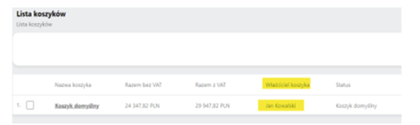 Uwaga! Istnieje możliwość, że Twój opiekun handlowy w One System utworzy koszyk w systemie i przypisze go do Twojej firmy. Będzie on widoczny dla wszystkich użytkowników. Status koszyka zmienisz wewnątrz koszyka lub podczas tworzenia nowego koszyka.